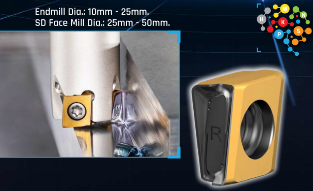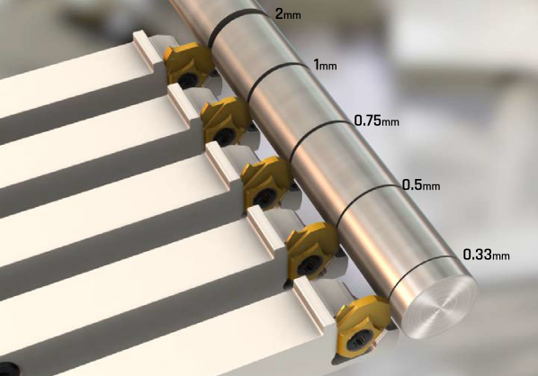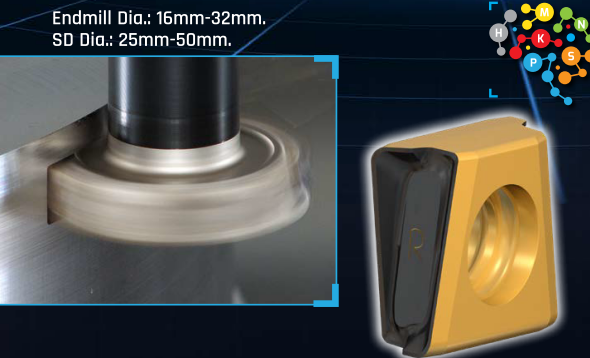 Фрезы для больших подач, при своих малых размерах, фрезы (и фрезерные головки) имеют большое количество гнезд для пластин (диаметр 16 мм - 3 пластины, диаметр 20 мм - 4 пластины, 25 мм - 5 пластин и т.д.), при этом пластины имеют 4 режущих угла.