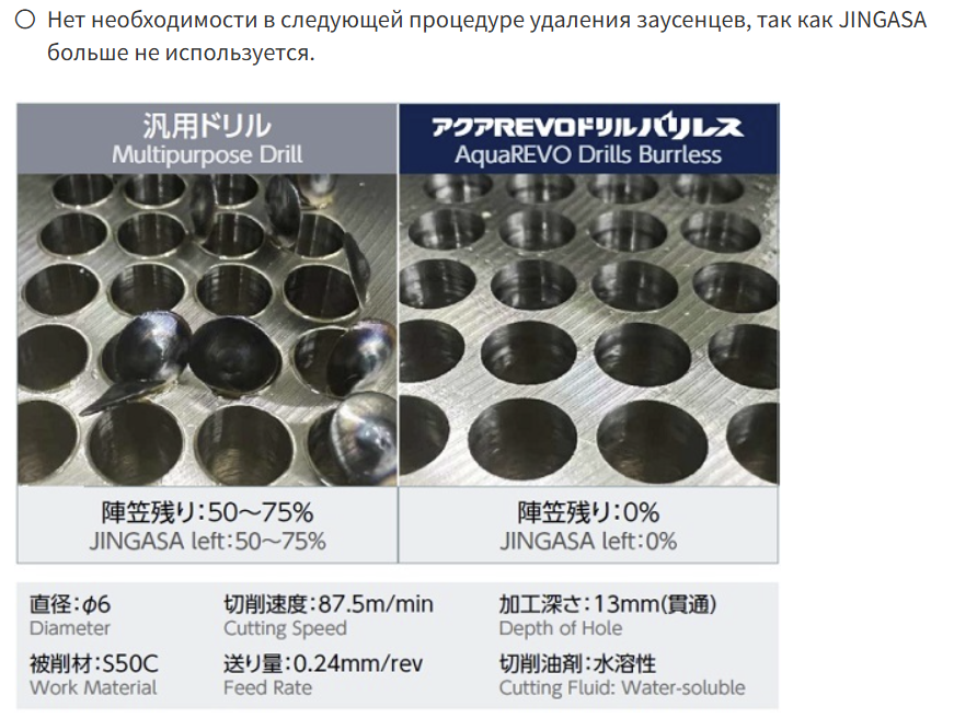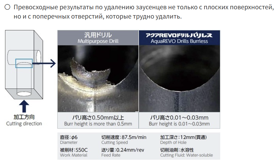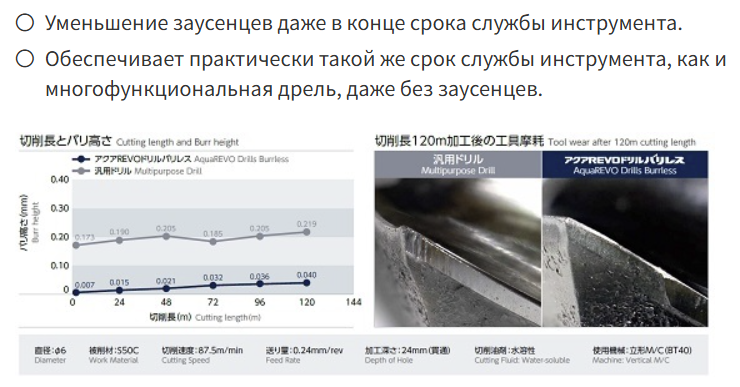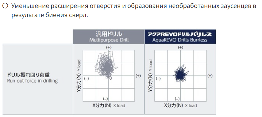 Nachi-Fujikoshi Corp.решение проблемы предлагает введением ряда конструктивных особенностей режущей части сверла. На ряду с радиусной формой заточки краев режущей части сверла, с увеличенным задним углом, на сверло дополнительно нанесено износостойкое тонкое покрытие, которое не только увеличивает стойкость режущей кромки, но и снижает трение, при этом покрытие не снижает остроты заточки режущей части.