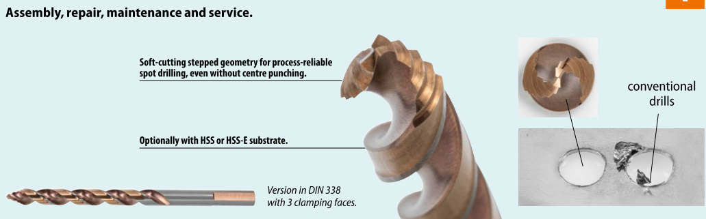 ■ Надежное точечное сверление без центрирования или продавливания по центру – даже на криволинейных поверхностях – благодаря инновационной заточке.