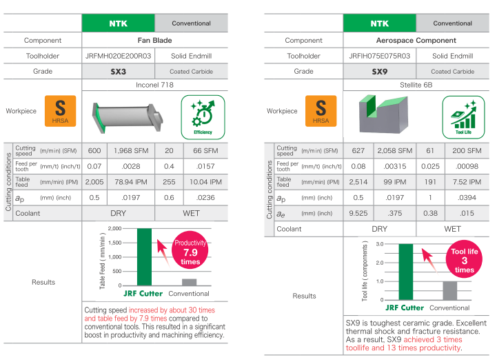 Такие компоненты, как турбинные диски и корпуса, должны выдерживать экстремальные условия, сохраняя при этом высочайший уровень надежности. Компания NTK , как лидер в области керамических решений, предлагает инновационные инструменты, разработанные для значительного повышения производительности при одновременном снижении затрат. Среди их наиболее новаторских разработок — керамические марки SiAlON SX3 и SX9 , а также фреза JRF . Эти передовые инструменты не просто продвигают отрасль вперед — они совершают в ней революцию.