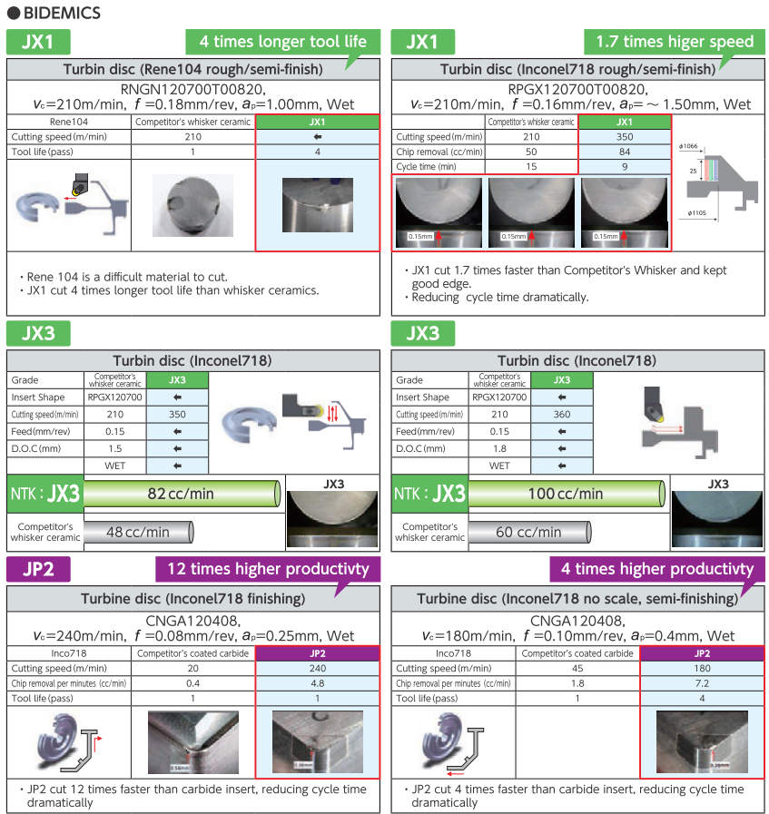 С помощью BIDEMICS компания NTK переосмысливает возможности токарной и нарезной обработки в условиях высоких скоростей. Сочетая сверхвысокие скорости, увеличенный срок службы инструмента, превосходное качество поверхности и долгосрочные экономические преимущества , BIDEMICS позволяет производителям удовлетворять самые жесткие требования аэрокосмической и энергетической отраслей .