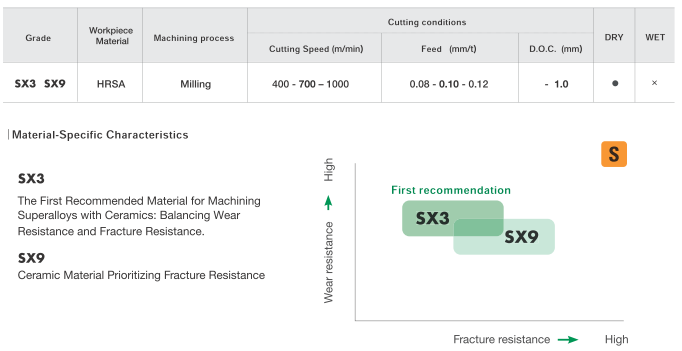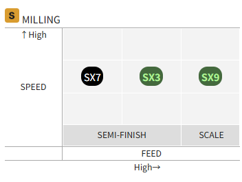 SX9 : В отличие от других материалов, SX9 оптимизирован для черновой обработки, где прочность имеет ключевое значение. Он обеспечивает высокую износостойкость в сочетании с повышенной прочностью, что позволяет ему выдерживать нагрузки в агрессивных условиях резания. SX9 способен выдерживать значительные механические нагрузки, что делает его идеальным для черновой и получистовой обработки, где важны как долговечность, так и скорость.