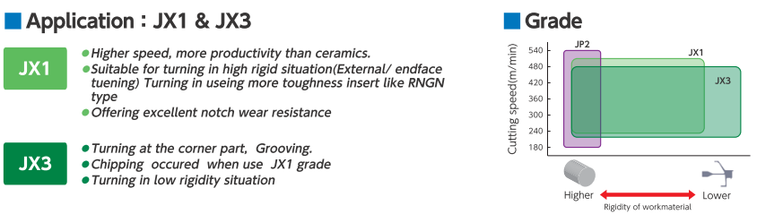 При токарной обработке дисков турбин материал JX1 обеспечил вдвое больший срок службы инструмента по сравнению с керамическим материалом с нитевидными кристаллами при скорости 240 м/мин и продемонстрировал способность увеличивать скорость резания до 360–480 м/мин при сохранении аналогичного срока службы инструмента.
