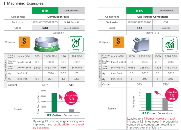 Крупный производитель аэрокосмической продукции обрабатывал компоненты из сплава Inconel 718 с использованием традиционных твердосплавных пластин, что приводило к частой смене инструмента и неэффективному времени обработки. После перехода на фрезу NTK JRF ( JRFMH032E320R05 ) , оснащенную пластинами RNGF090400E-HNF марки SX9 , были достигнуты значительные улучшения:
