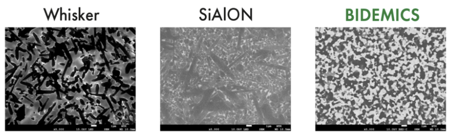 BIDEMICS — это усовершенствованный керамико-карбидный композитный материал для режущих инструментов от NTK , специально разработанный для обработки на сверхвысоких скоростях. В отличие от традиционной керамики с нитевидными кристаллами, BIDEMICS сочетает в себе мелкие зерна оксида алюминия с частицами карбида вольфрама . Такая структура не только обеспечивает очень высокую прочность и твердость , но и способствует эффективному рассеиванию тепла при резании , обеспечивая стабильную работу на сверхвысоких скоростях.