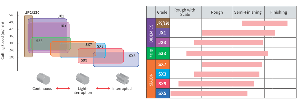 Благодаря такому сочетанию материалов, BIDEMICS обладает большей износостойкостью и термостойкостью, чем обычные керамические марки, что объясняет возможность работы при скоростях резания до 500 м/мин, где обычно разрушаются нитевидные кристаллы.
