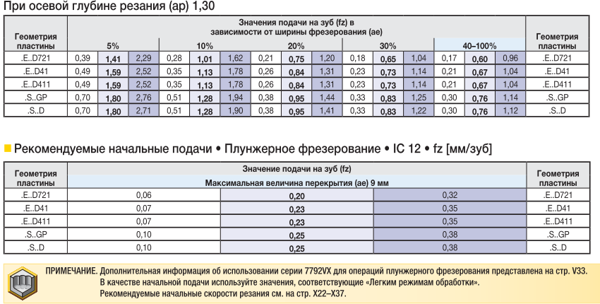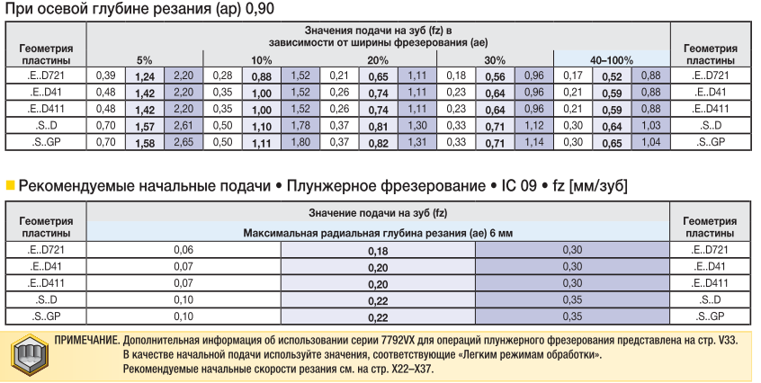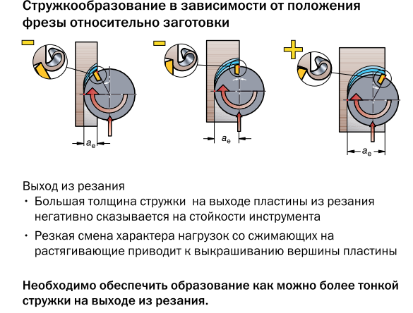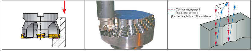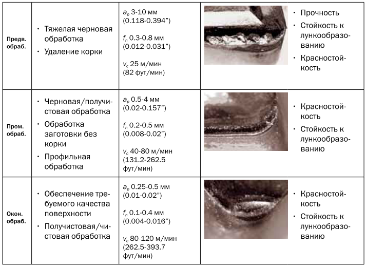 Черновая обработка ведется на невысоких скоростях с большой подачей и глубиной (глубина резания более дефектного слоя). Применяются пластины как без покрытия, также и с износостойким покрытием на динамически прочной основе, с большими радиусами, передними углами и упрочняющими фасками, угол в плане чаще выбирают 45 градусов с минимальным вылетом инструмента.