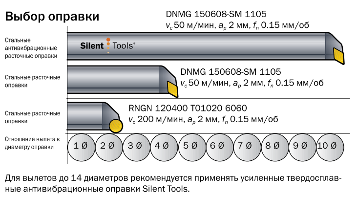 При выполнении расточных операция следует выбирать по возможности большее сечение державок, твердосплавные державки, державки с виброгашением. Применять пластины с меньшими радиусами при вершине с позитивной геометрией. Применять державки с внутренней подачей СОЖ под высоким давлением.