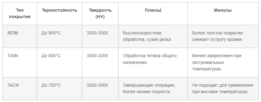 При выборе инструментов с покрытием для обработки титана толщина покрытия становится важным фактором. Хотя более толстое покрытие обеспечивает лучшую защиту от износа на черновых операциях (при работе по корке), но и в тот же момент оно больше скругляет (притупляет) режущую кромку, что особенно важно, учитывая склонность титана к упрочнению при обработке. Оптимальная толщина покрытия обычно составляет от 2 до 4 микрон, обеспечивая баланс между защитой и остротой режущей кромки. Предпочтение отдают PVD покрытиям (они позволяют лучше сохранить остроту режущей кромки).