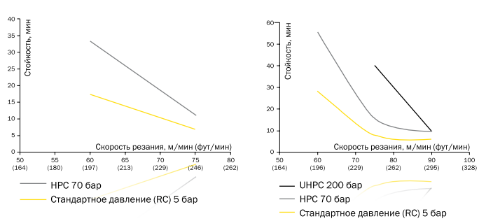 Применение подачи СОЖ под высоким давлением улучшает контроль над стружкообразованием и повышает стойкость пластины, обеспечивайте эффективную эвакуацию стружки.Точность направления подачи СОЖ обеспечивает лучшее охлаждение, что позволяет вести обработку с более высокой скоростью резания. Применение насосов сверхвысокого давления СОЖ до 200 бар, позволяют увеличить стойкость инструмента до 2-3 раз, по сравнению с источником давления СОЖ до 70 бар. Отдельно ниже будет сказано про криогенные средства охлаждения, которые тоже позволяют не только значительно понизить температуру в зоне резания, но и изменить пластичность титановых сплавов и облегчить резание.