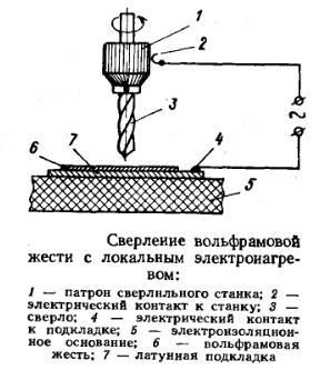 Отверстия малого диаметра в тонком листовом вольфраме можно получать и способом локального электроподогрева, с источником напряжения 2-10 В. При соприкосновении сверла и заготовки вольфрама, из-за резистивного нагрева, температура в зоне соприкосновения повышается и его пластичность увеличивается. Значение тока подбирается экспериментально, с контролем температуры в зоне резания в пределах 150-250 градусов.