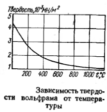 Изменение твердости вольфрама от температуры нагрева показано на рисунке ниже. Так же было выявлено, что оптимальной температурой нагрева вольфрама от внешнего источника тепла (например газовой горелкой) является 350-420 градусов Цельсия. При более высоких температурах подогрева в вольфраме возникают структурные изменения.
