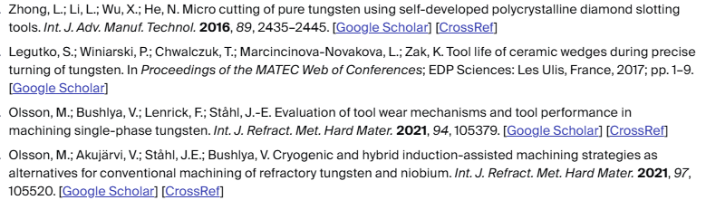 Наблюдения за износом кромки инструмента показало, что влияние скорости резания не является монотонным. При скоростях до 200 м/мин быстрый износ инструмента был объяснен истиранием из-за образования нестабильного нароста на режущей кромке и конкуренцией между хрупким и пластичным режимами деформации. Снижение износа инструмента, характерно для размазывания. Наконец, повышенное термическое напряжение было названо причиной дальнейшего увеличения износа. Это исследование показало, что качество поверхности вольфрама можно контролировать путем тщательного учета параметров обработки, включая скорость резания, передний угол и температуру предварительного охлаждения.