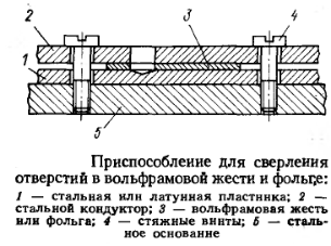 Сверление тонких заготовок вольфрама рекомендовано производить пакетом с применением дополнительных накладок из малоуглеродистой стали толщиной 3-5 мм, или латуни.
